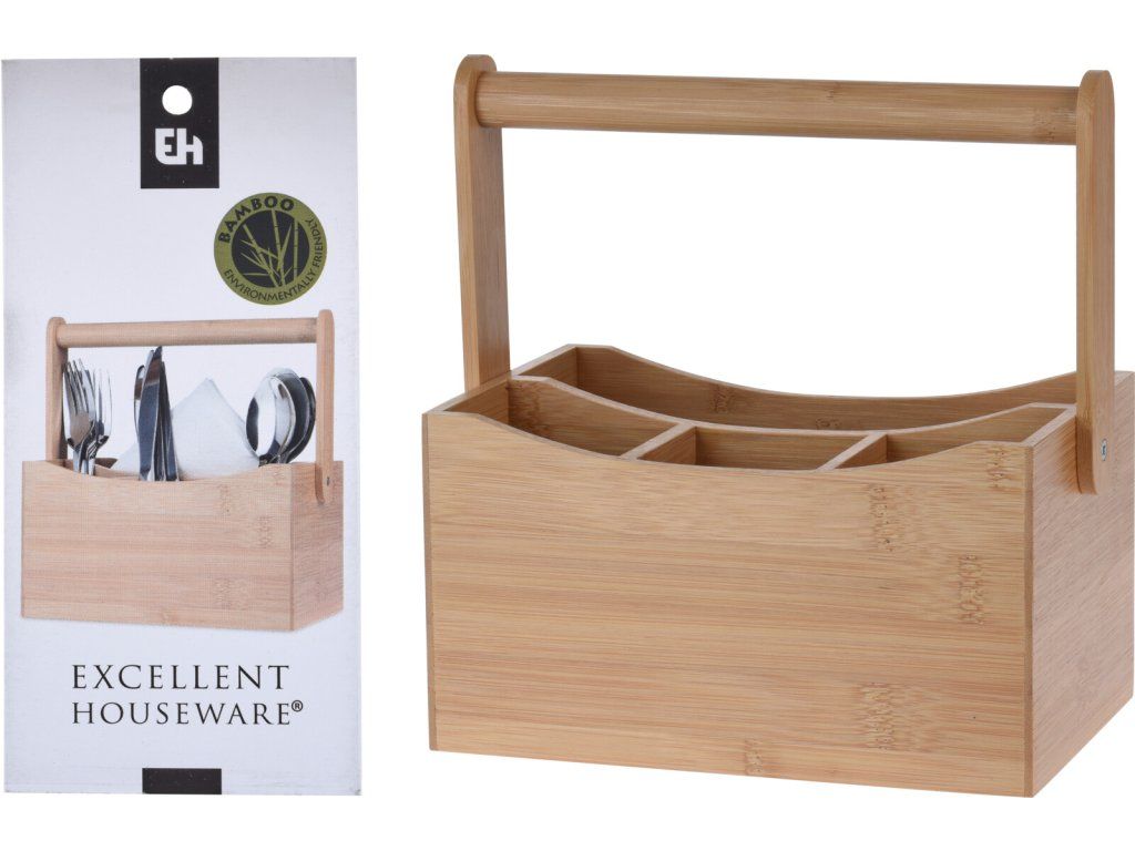 Bambusový držák na příbory je skvělou volbou pro všechny, kteří hledají praktický a elegantní způsob, jak uložit své příbory. Má čtyři přihrádky, pohodlně do něj uložíte příbory i ubrousky. Rozměry: 23x14x23,5 cm, výška bez rukojeti 12 cm.