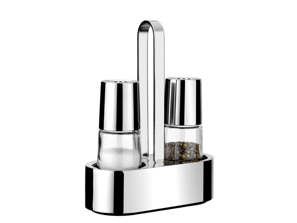Krásná a praktická stolní dochucovací souprava. Vhodná pro domácnosti i gastronomická zařízení. Vyrobena z prvotřídní nerezavějící oceli a skla. Výška stojanu 16 cm, výška nádobky 10 cm.