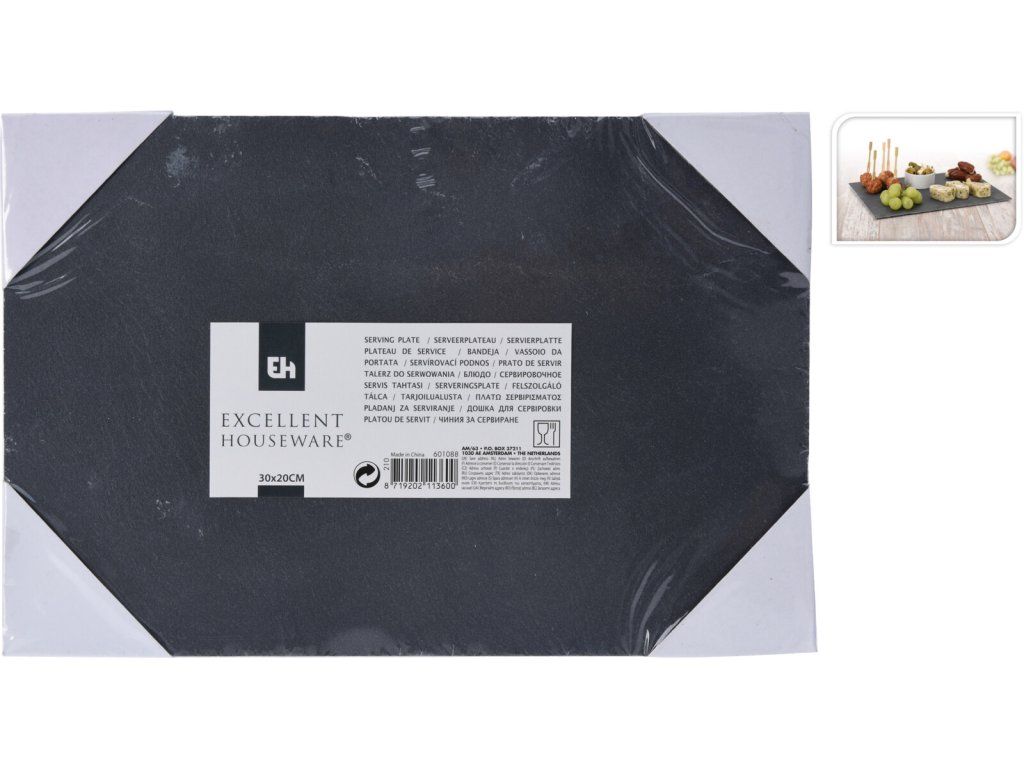 Servírovací podnos o rozměrech 30x20 cm je vyrobeny z černé břidlice. Zlomené hrany podtrhují autentický vzhled, gumové nožičky chrání povrchy vašeho nábytku. Díky neobvyklému materiálu je podnos ideální pro jemné sýry a salámy a ovoce. Nejen že skvěle vypadá na stole nebo bufetu, je taky praktický. Břidlice je odolná proti prořezání a neabsorbuje žádné pachy.