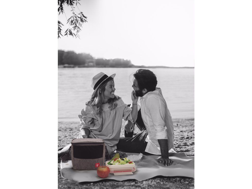 Obsahuje vnitřní síťovanou kapsu na příbory, ubrousky nebo jiné osobní věci. Navíc ji lze nosit jako tašku přes rameno díky výškově nastavitelnému popruhu.