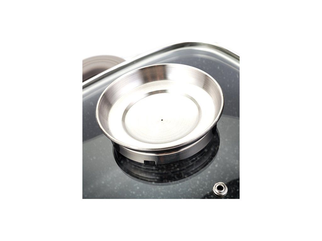 Zapékací hrnec o o rozměrech 28x28 cm je ideální pro každodenní použití v kuchyni. Kombinuje kvalitu s moderním designem. Jedná se o praktický hrnec vyrobený z litého hliníku s nepřilnavým povrchem bez PFOA. Ergonomické rukojeti s odnímatelnými silikony pro příjemné a bezpečné uchopení. Součástí je poklice s odolným termo úchytem. Vynikající rozložení teploty pro dokonalou přípravu jídel. Snadno se čistí, je vhodný i do myčky na nádobí. Hrnec je vhodný i pro použití v troubě (bez úchytů). Hrnec má průměr základny 18,5 cm, výšku 16 cm a objem 6,3 l. Váha 2 kg