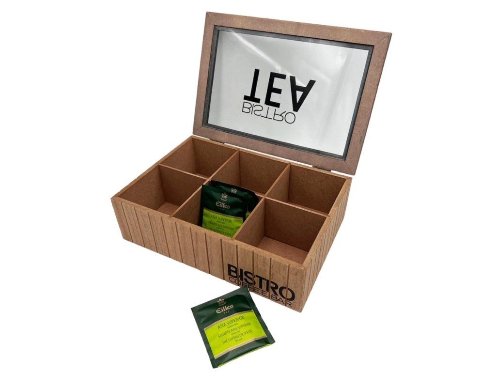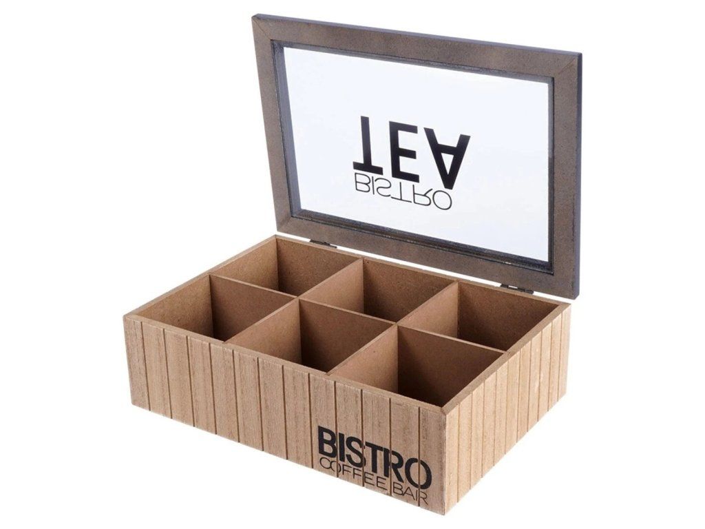 Díky čajové krabičce můžete své oblíbené čaje uschovat přehledně a návštěvě je nabízet se stylem a elegancí. Krabička je vyrobena z borovicového dřeva s atraktivním potiskem a má 6 přihrádek, takže je dostatečně prostorná, aby se do ní vlezly všechny Vaše oblíbené čajové sáčky. Krásný designový doplněk nebo perfektní dárek pro milovníky čaje.