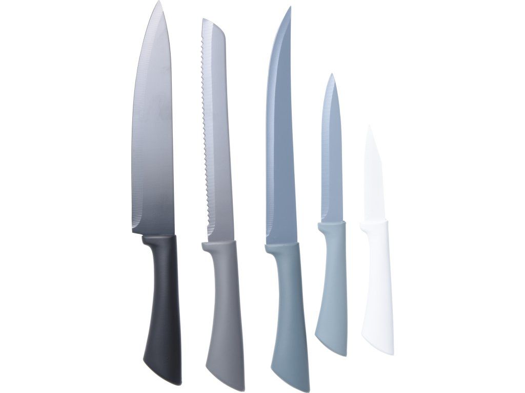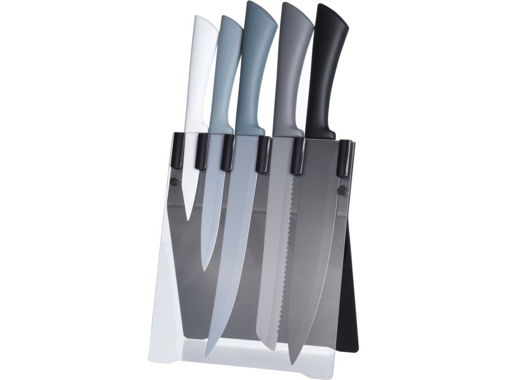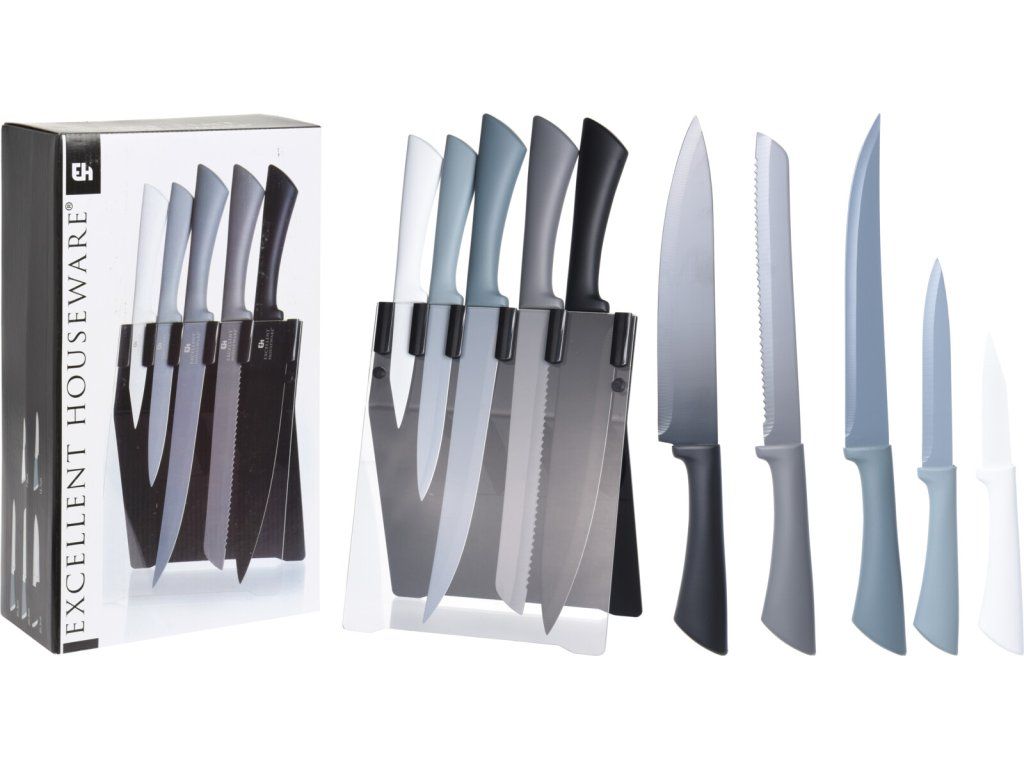 Kuchyňské nože Excellent si bez problémů poradí se všemi druhy potravinářských výrobků. Součástí je stojánek na nože. Sada obsahuje 5 nožů: nůž na chleba, krájecí nůž, ostřící nůž, kuchařský nůž, nůž na maso. Doporučuje se ruční mytí.