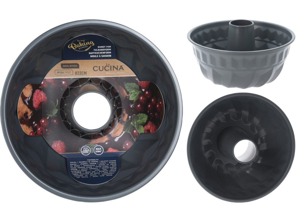 Forma na bábovku je vynikající pro pečení sladkých i slaných pokrmů. Je opatřena vysoce odolným nepřilnavým povlakem, který zabraňuje připalování, je vhodná do elektrické, plynové i horkovzdušné trouby, také do myčky. PFOA free, max. teplota 230 C. lze do mrazničky. Po upečení lze bábovku z formy snadno vyklopit.