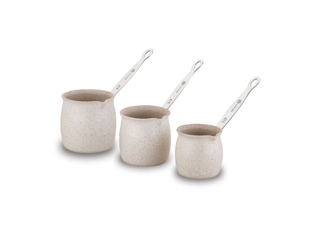 Džezvy jsou nezbytné k přípravě pravé turecké kávy. Tato sada obsahuje konvičky na přípravu dvou, třech a čtyř šálků kávy. Objem džezev: 2 šálky - 100 ml, 3 šálky - 200ml, 4 šálky - 300 ml. Jsou opatřeny granitovým nepřilnavým povrchem, díky kterému se káva nepřipálí a navíc jsou odolné proti poškrábání. Džezvy mají rukojeti z nerezové oceli a jsou vhodné pro všechny typy plotýnek kromě indukce. Příprava pravé turecké kávy: Do džezvy se nasype velmi jemně namletá káva - 7 gramů na 1 deci vody. Přidá se podle chuti cukr a případně i koření - např. skořice. Vše přelijeme studenou vodou a směs se nechá pomalu zahřívat na sporáku. Ve chvíli, kdy vzkypí a pěna dosáhne na okraj nádoby se džezva odstaví, aby pěna spadla. Káva nesmí projít varem! Vaření se opakuje ještě dvakrát a teprve pak se káva nalévá do šálků a servíruje.