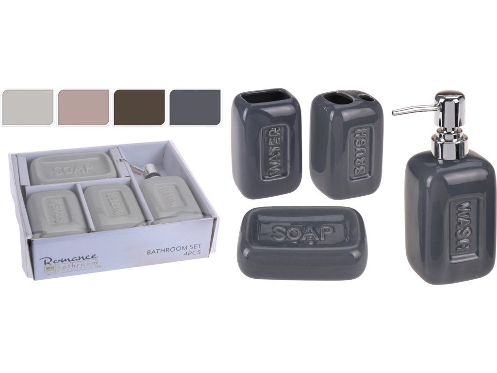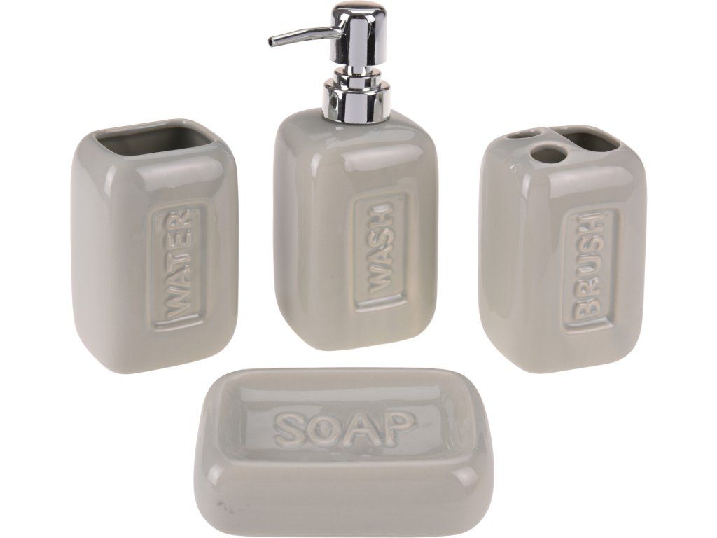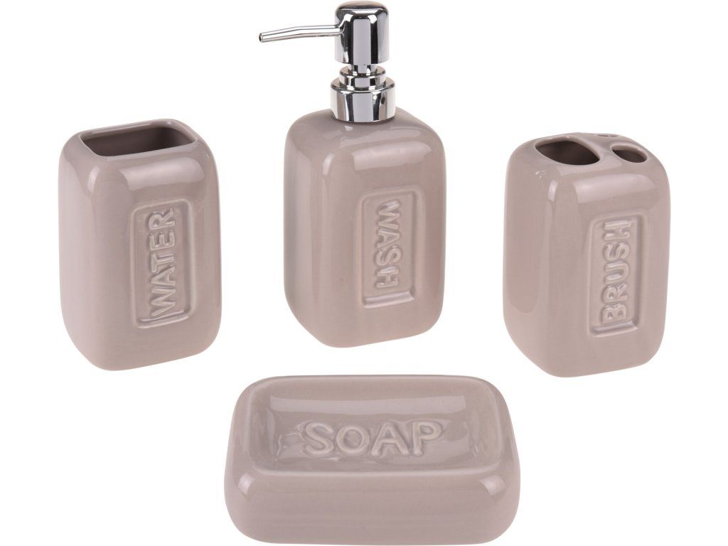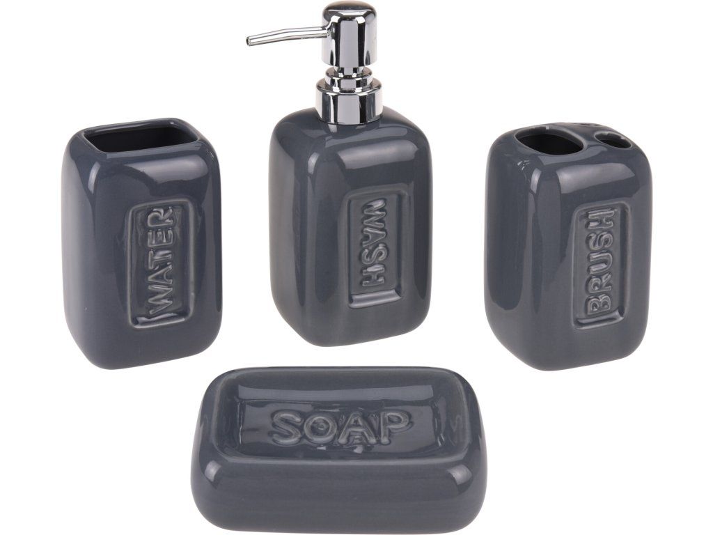 - dóza 7 x 7 x 10,8 cm; držák kartáčků 7 x 7 x 10,5 cm; mýdlenka 13 x 9 x 2,5 cm; dávkovač tekutého mýdla 7,5 x 7,5 x 19,5 cm.