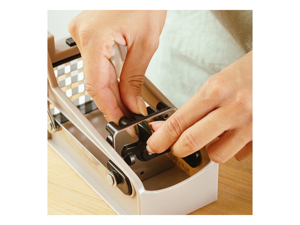 - Rám je vyroben z vysoce kvalitního plastu, zatímco odolné čepele jsou vyrobeny z nerezové oceli, vhodné pro styk s potravinami.