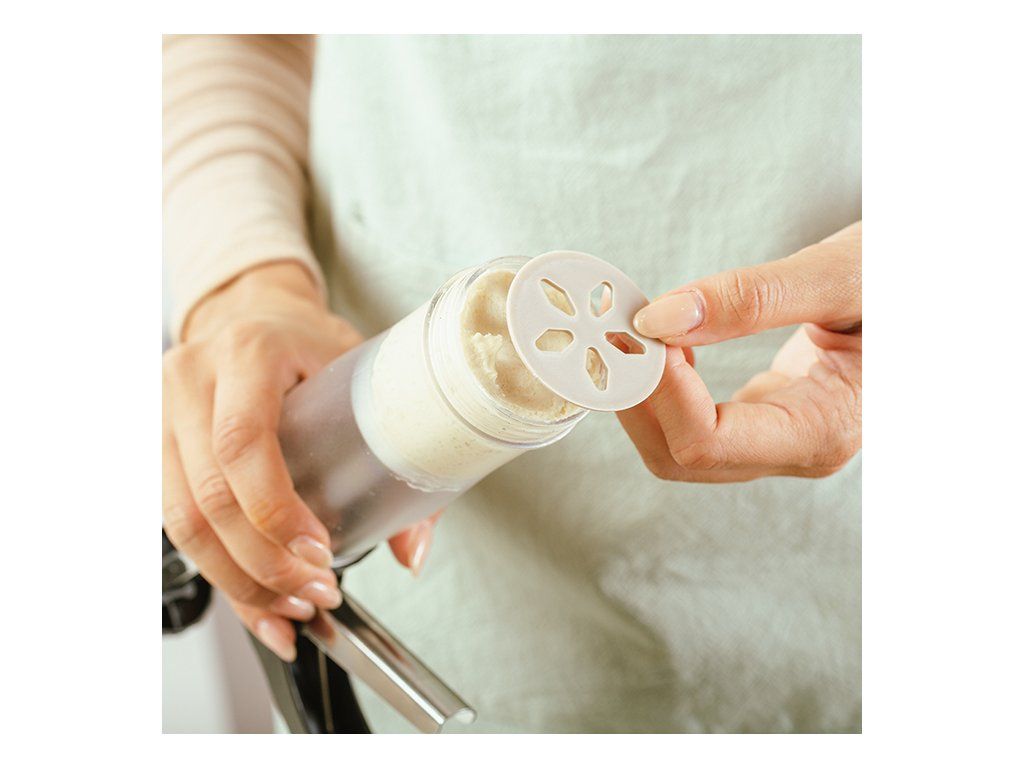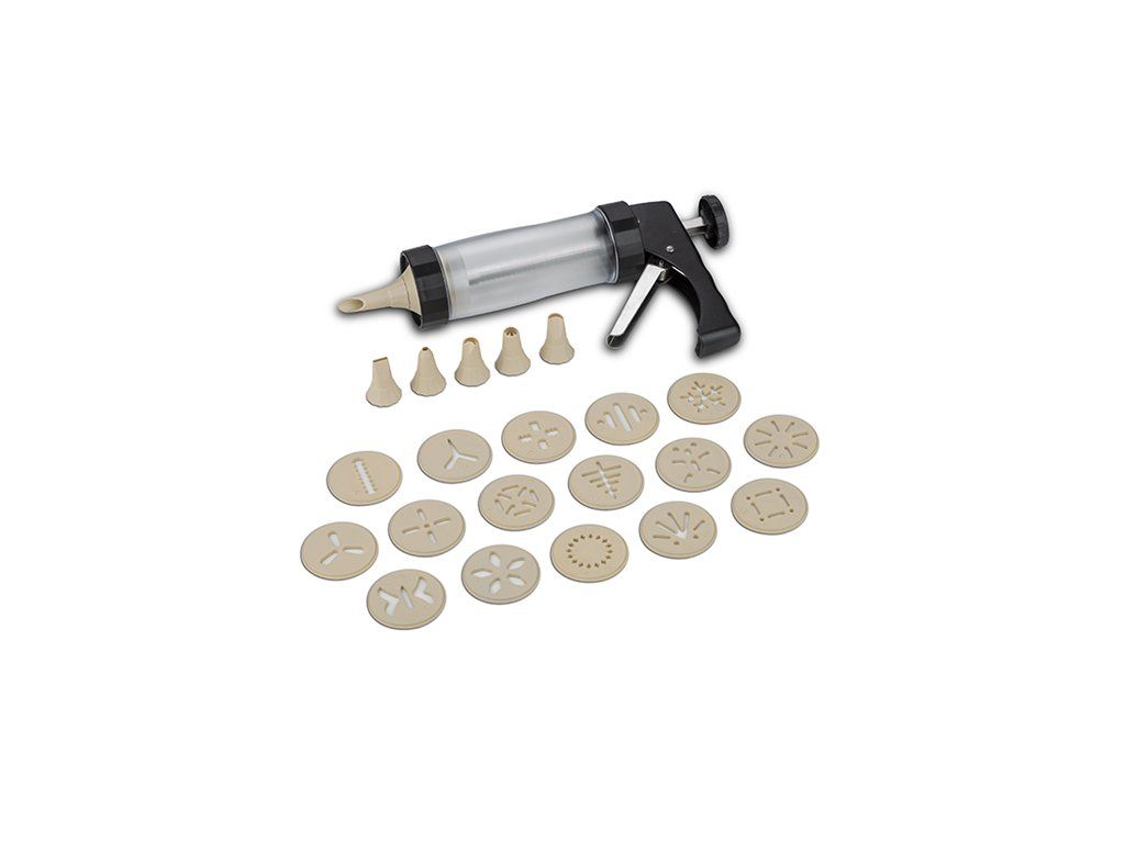 Sada obsahuje 1 tvořítko na cukroví a pistoli, 16 náhradních dílů vykrajovacích kotoučů na cukroví a 6 zdobicích trysek.