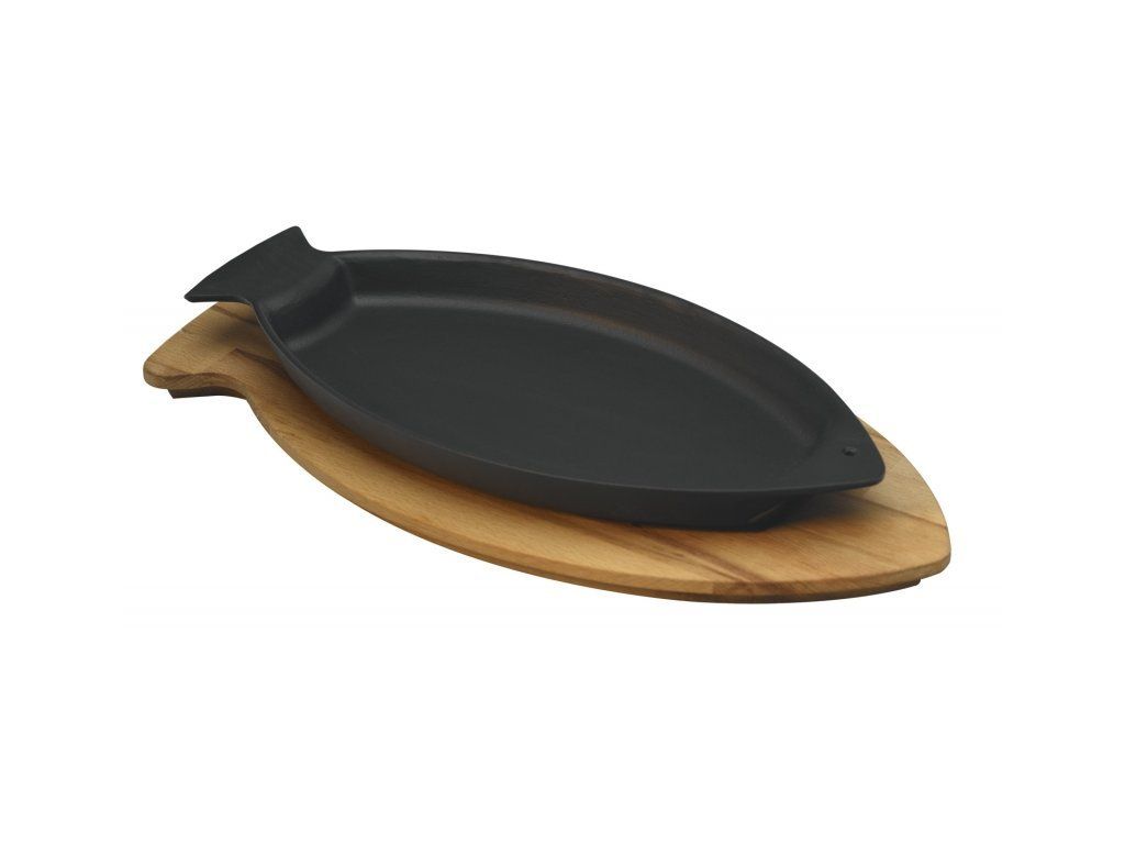 Litinová pánev "ryba" 20x32cm s dřevěným podstavcem