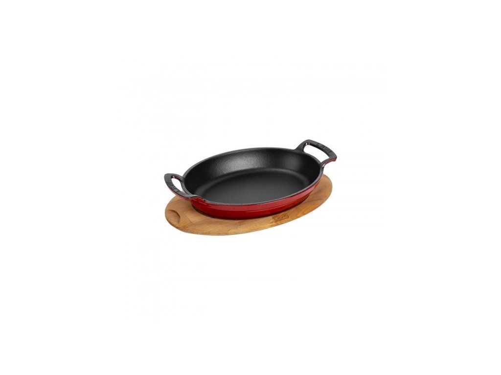Litinová pánev 19x14 cm s dřevěným podstavcem - červená
