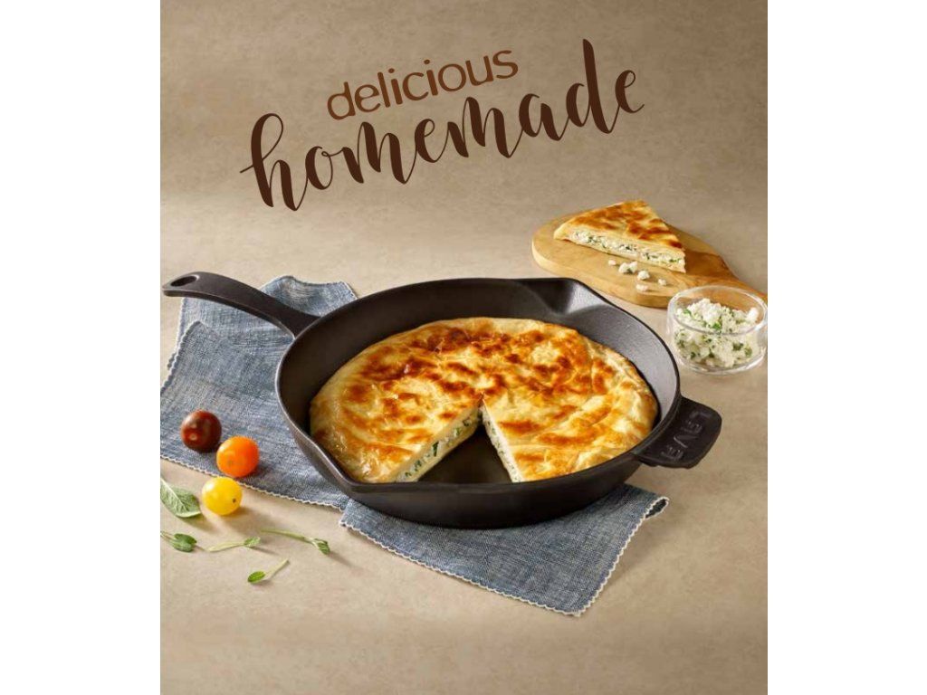 Litinové pánve a hrnce patří k nádobí, které po staletí patří k těm nejpoužívanějším. A dědí se doslova z generace na generaci. Nádobí z litiny ocení zejména kuchaři a kuchařky, kteří milují pomalé vaření. Litina patří k materiálům, které úžasně vedou teplo, sice se pomaleji zahřívá, ale zahřívá se rovnoměrně a po celé ploše. Díky tomu, že litina teplo akumuluje, můžete z pánve v klidu servírovat – jídlo nebude rychle studené. Pánev lze používat na všechny typy sporáků i ploten, včetně indukce. Můžete ji využít i jako zapékací mísu do trouby. Průměr pánve je 34 cm, výška 6,5 cm s celkovým objemem 4l. Pánev je opatřena praktickými výlevkami po obou stranách.