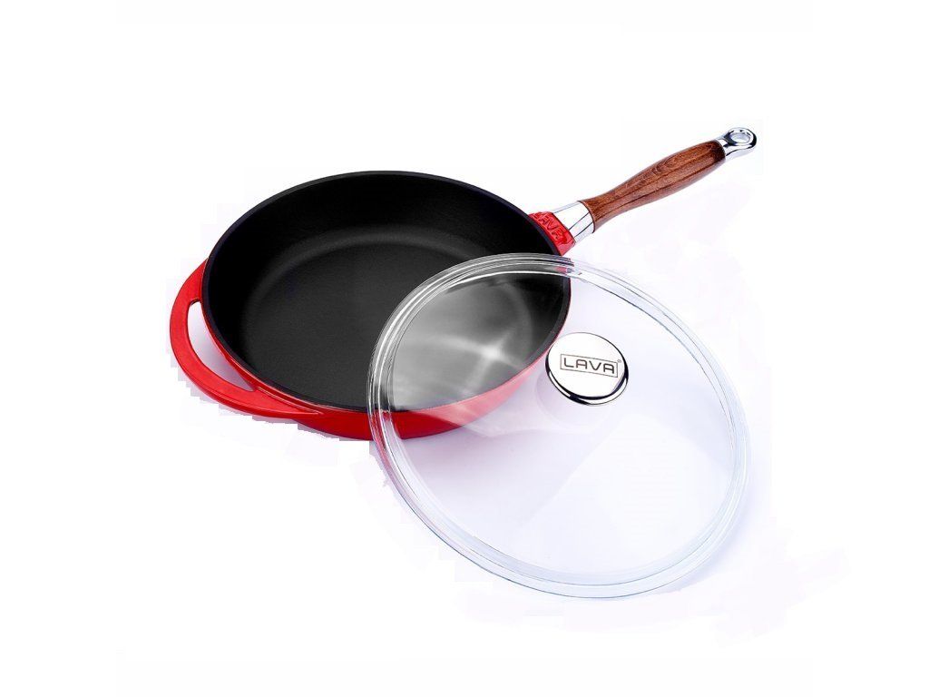 Litinová pánev s dřevěnou rukojetí a skleněnou poklicí 24 cm - červená