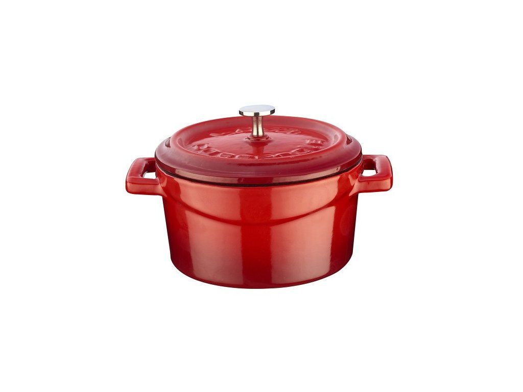 Sytě červený hrnec s vnitřním provedením z bílého smaltu v mini velikosti, typ kokotka (z francouzského cocotte, kastrůlek). Průměr hrnce 10 cm, objem 0,35 l, skvělý pro 1 porci pokrmu, je ideální také pro stylové servírování přímo na prostřeném stole. Hrnec se tak stane ozdobou Vaší kuchyně. Litina samotná nabízí velmi vysokou tepelnou vodivost, což v kombinaci se značnou silou materiálu zaručuje vysokou efektivitu při vaření. Vhodný pro všechny druhy sporáků, včetně indukce. Mytí v myčce se nedoporučuje z důvodu utlumení jasu barev.
