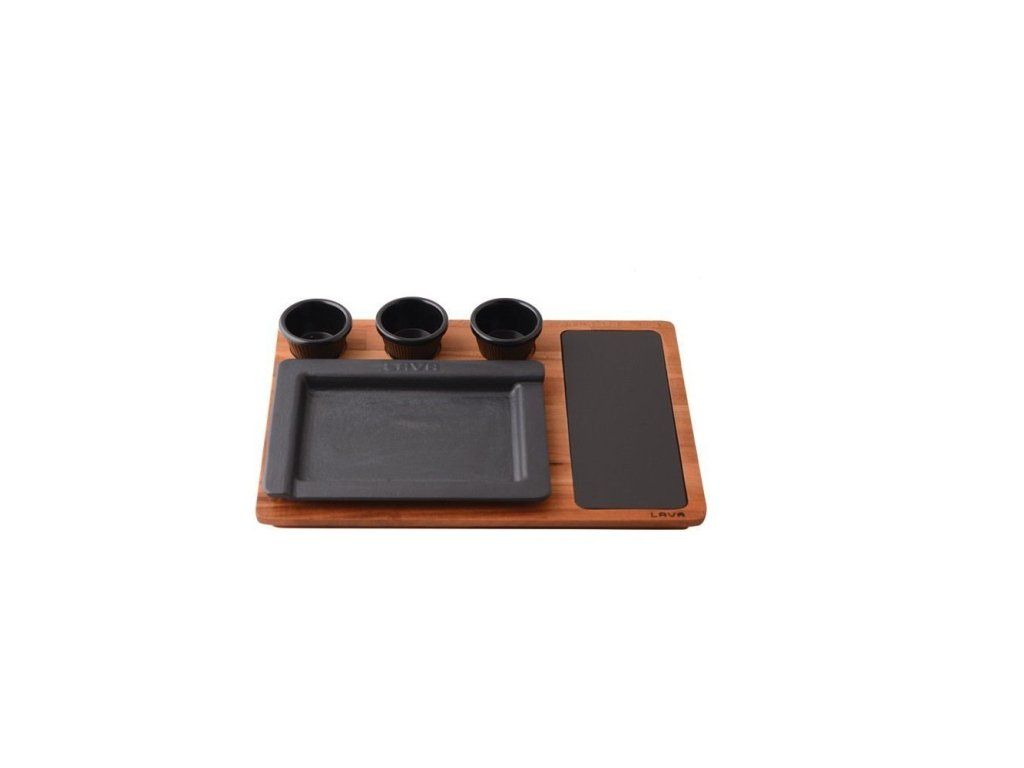 Obdelníkový litinový talíř/plotýnka, rozměry talíře 26x19 cm, velikost podstavce 28x39,5 cm. Součástí je dřevěný servírovací podstavec pro snadnou manipulaci s horkým talířem, navíc na něm můžete stylově servírovat jídlo přímo na stůl. Na podstavci je také porcelárnová plotýnka vhodná pro krájení potravin. Díky schopnosti udržet teplo se jídla dají dovařovat při nízké teplotě, což přináší úsporu energie. Talíř je stabilní a dá se používat na všechny typy sporáků i ploten, včetně indukce. Vhodný je také na všechny druhy grilů a do trouby (bez podstavce). Má nepřilnavý povrch a rychle reaguje na změny teplot. Melaminové nádobky na omáčky nejsou součástí sady.