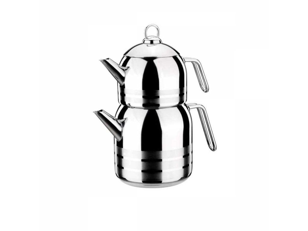 Dvojitá konvice Mega je praktický kousek do Vaší kuchyně. Je vyrobena z prvotřídní nerezové oceli, leštěný povrch jí dodává elegantní vzhled. Konvice je ideální na přípravu pravého tureckého čaje. V dolní části se vaří voda, v horní části se napařují lístky čaje, které se asi po 15 až 20 minutách zalijí vařící vodou a nechají se 20 minut louhovat. Nálev z horní části konvice se ředí podle chuti horkou vodou ze spodní části. Konvice se samozřejmě mohou používat i samostatně. Ergonomicky tvarovaná rukojeť pro snadnou manipulaci, nerezové pokličky jsou součástí dvojkonvice. Lze mýt v myčce.