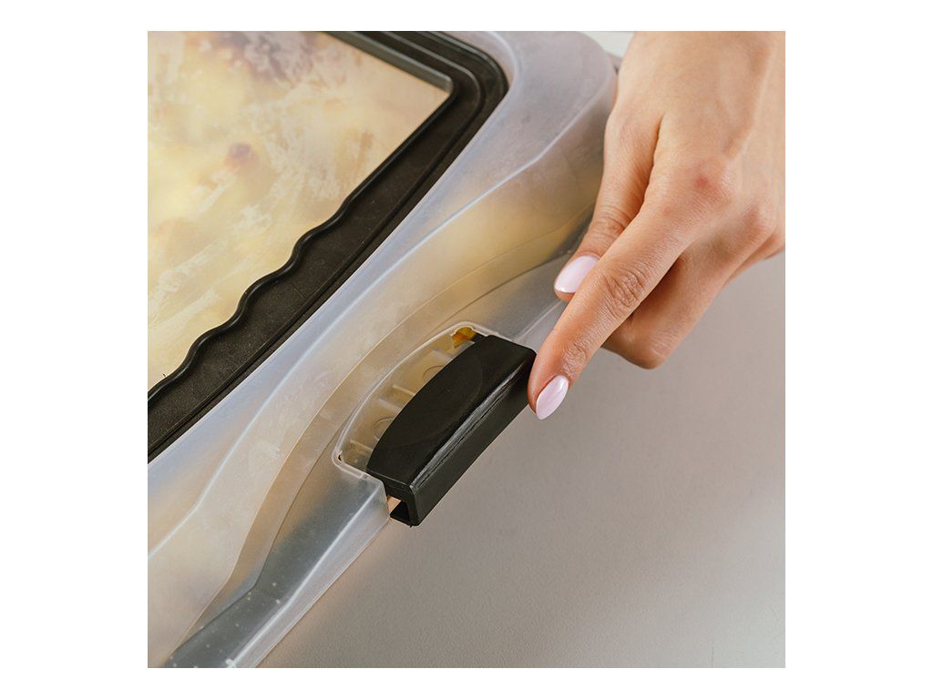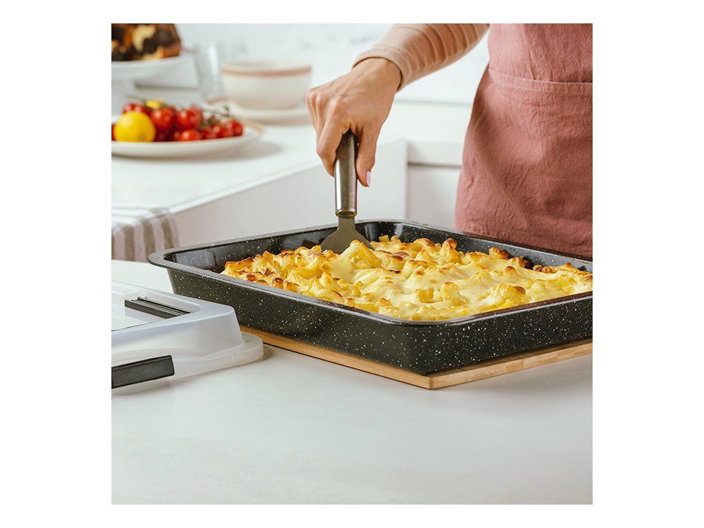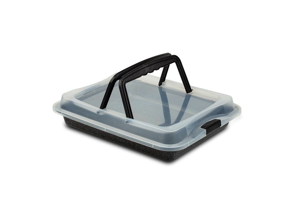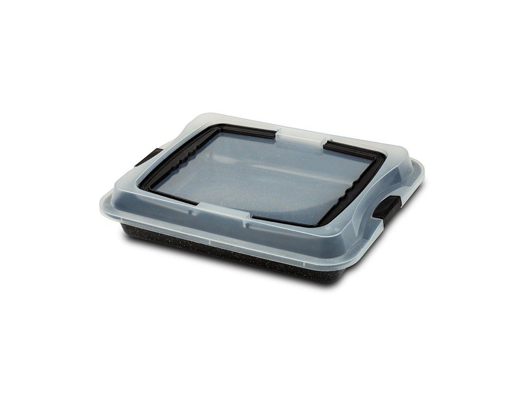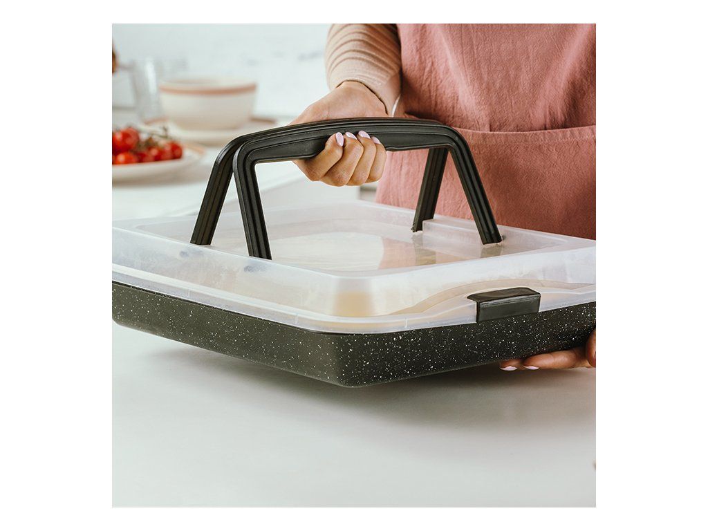 Jedná se o praktický plech s nepřilnavým povrchem bez PFOA. Pekáč má uzavírací víko s klipsy na obou stranách pro stabilní a bezpečné uzavření . Víko je vyrobeno z kvalitního plastu vhodného pro styk s potravinami a má dvojité madlo pro snadné přenášení plechu. Před vložením plechu do trouby víko sejměte !!