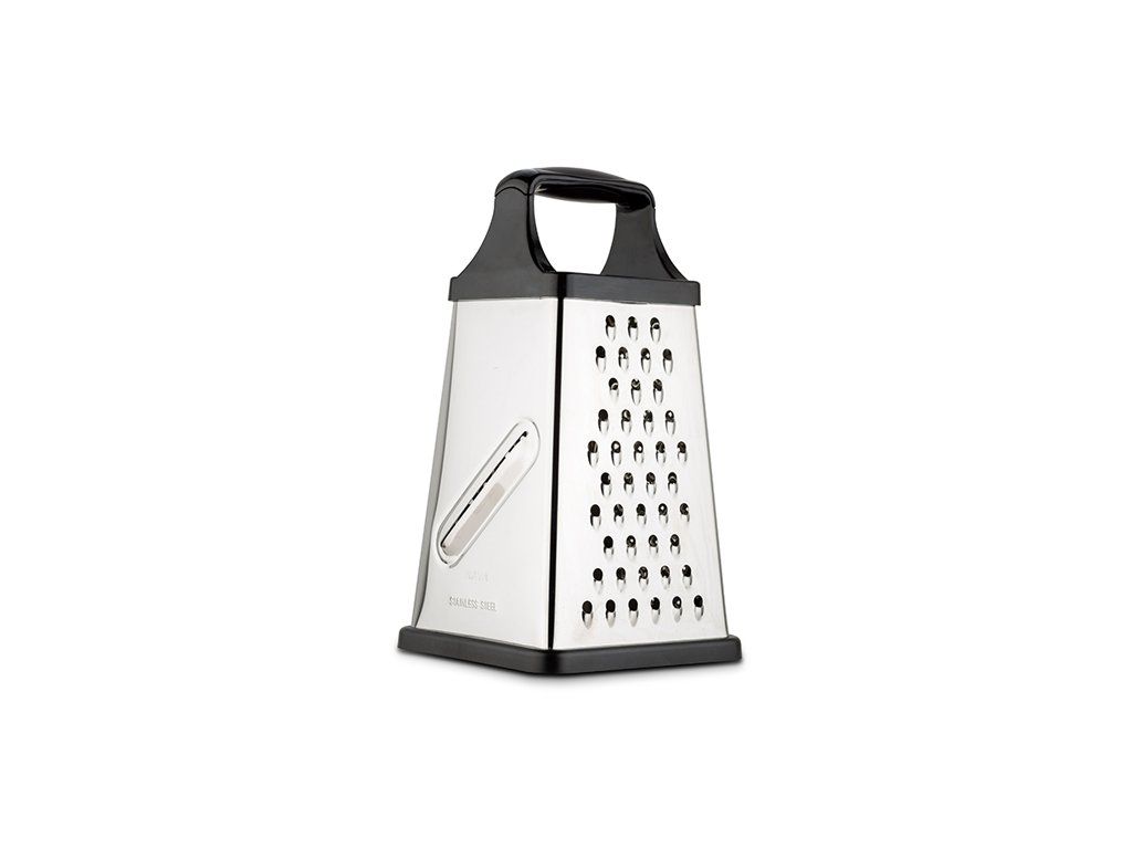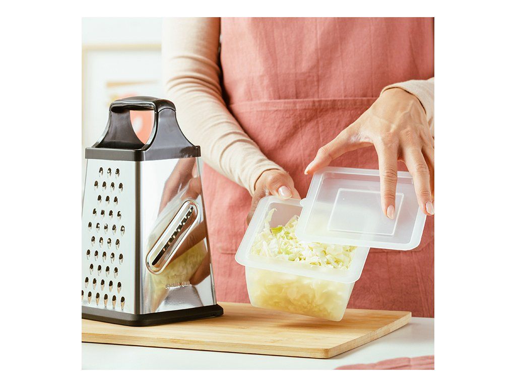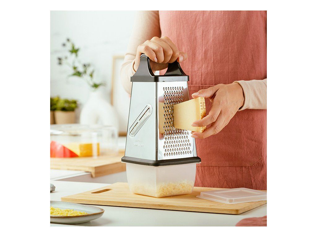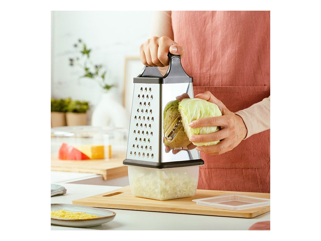 Disponuje integrovanou plastovou úložnou miskou pro strouhání a přímé uložení a 4 povrchy, které nabízejí 4 různé velikosti strouhání : silné, střední, tenké a jedna strana pro tenké plátky.