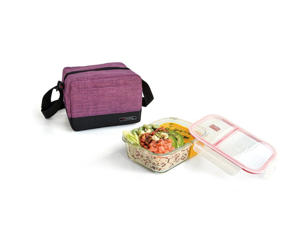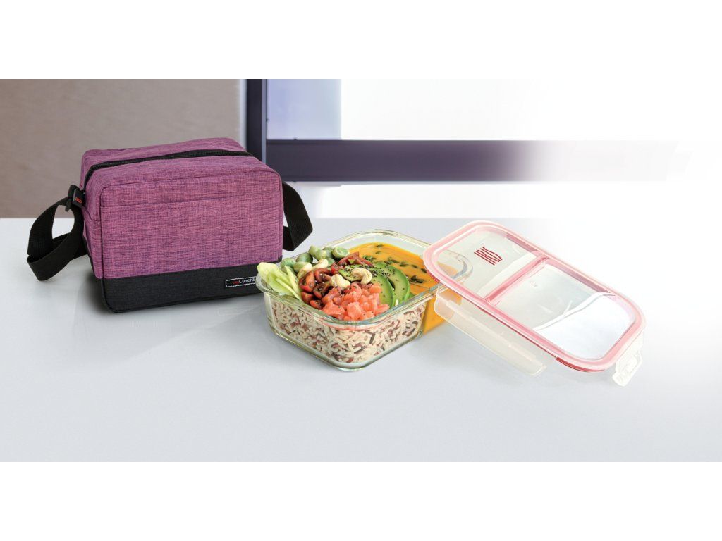 Taška obsahuje skleněnou dělenou dózu o objemu 0,95l, do které si můžete vzít jídlo s sebou. Nádoba má dvě části, je možné si tak do jedné dózy rozdělit potraviny, aniž by se pokrm promíchal, dóza je vhodná do myčky nádobí a mikrovlnné trouby; víko bez BPA. Naše taška pojme vše, co potřebujete ke snídani, obědu nebo svačině.