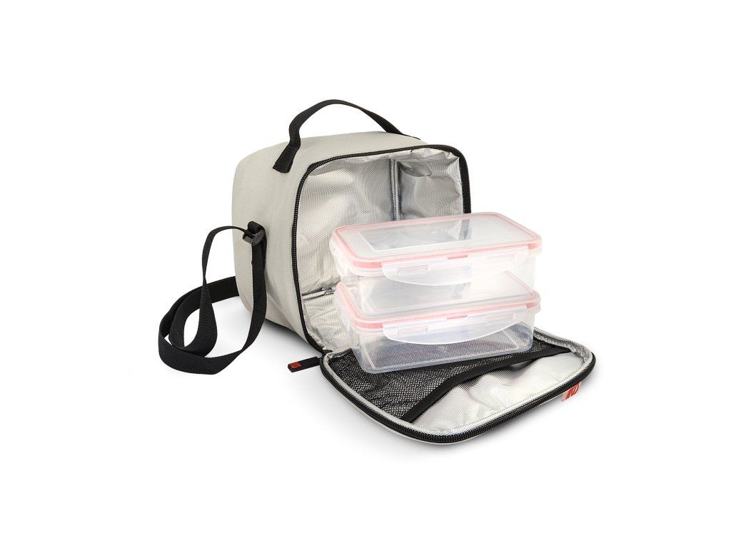 Vnitřní část tašky je tepelně izolovaná a vytváří "efekt ledničky", ta pak lépe chrání jídlo a jeho čerstvost během přepravy. Taška má elegantní, moderní design, rukojeť a nastavitelnou pásku přes rameno. Vnitřní síťovaná kapsa je ideální na ukládání příborů, ubrousků a vnější kapsička je připravena na vaše osobní předměty.
