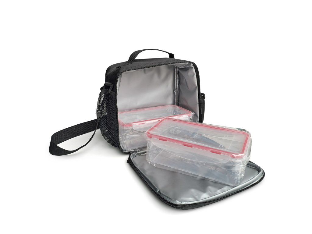 Taška Total obsahuje dvě plastové nádoby o objemu 0,8l, do kterých si můžete vzít jídlo s sebou. Jsou 100% hermetické; vhodné do myčky nádobí a mikrovlnné trouby; bez BPA. Naše taška pojme vše, co potřebujete ke snídani, obědu nebo svačině.