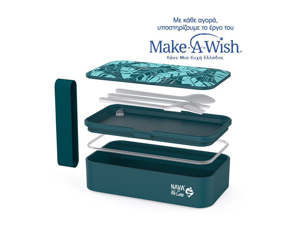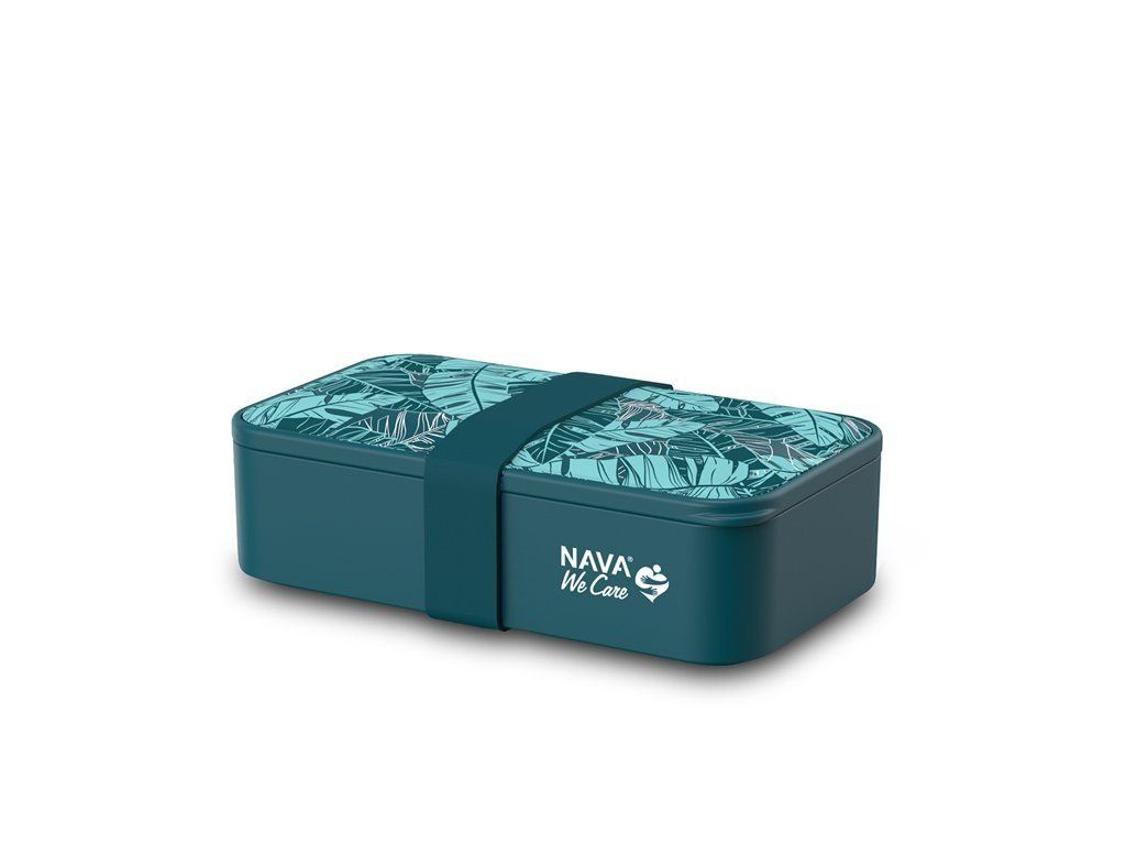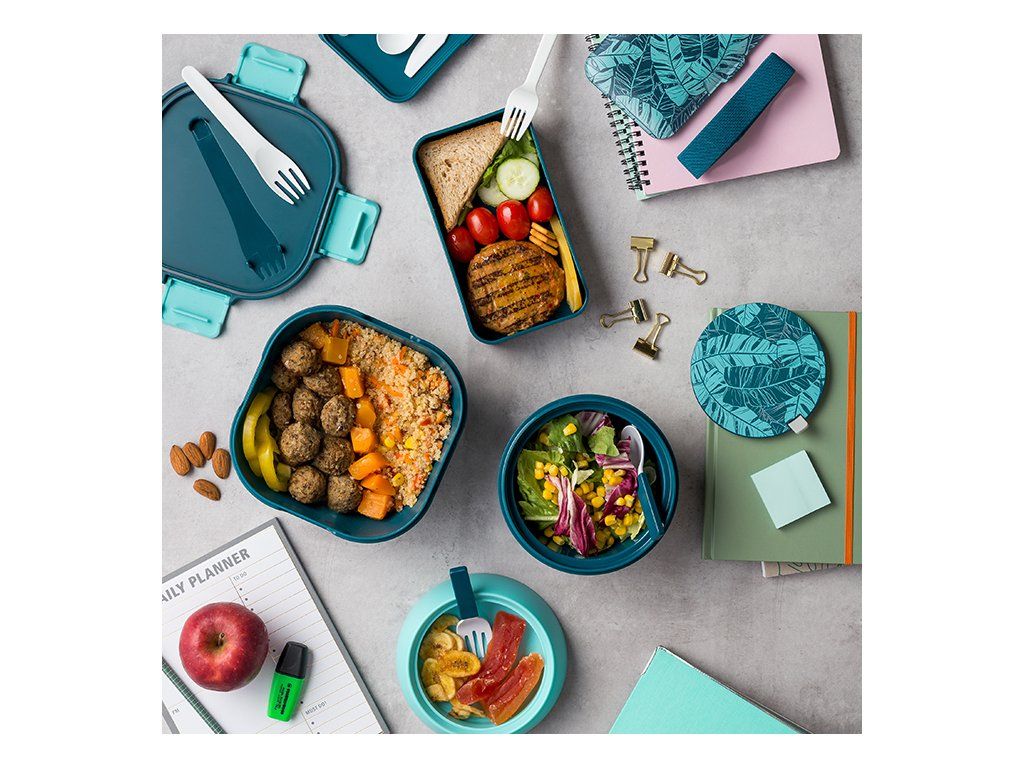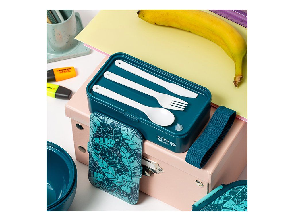 Víko má silikonový kroužek pro vzduchotěsné uzavření, aby se zabránilo úniku během přepravy. Ve víku je přihrádka a uvnitř najdete lžíci, vidličku a nůž. Nádobu navíc zajišťuje elastická páska .