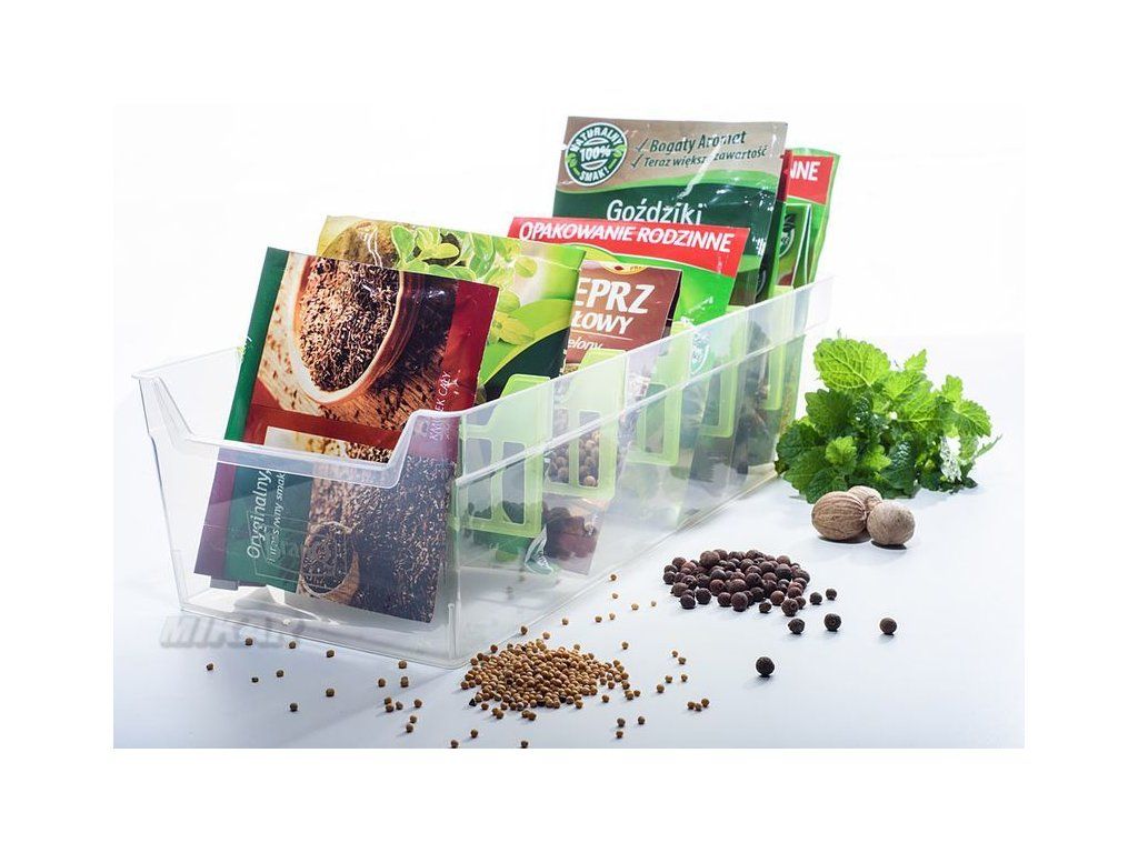 Organizér je vynikající pro přehledné uspořádání sáčků na koření a dochucovadel obvyklé velikosti. Je opatřen pěti přepážkami, dá se pohodlně umístit do zásuvek a přihrádek kuchyňských skříněk. Je vyroben z kvalitního, zdravotně nezávadného plastu. Rozměry 307 x 113 x 80 mm. Barevné provedení - transparentní/zelená.