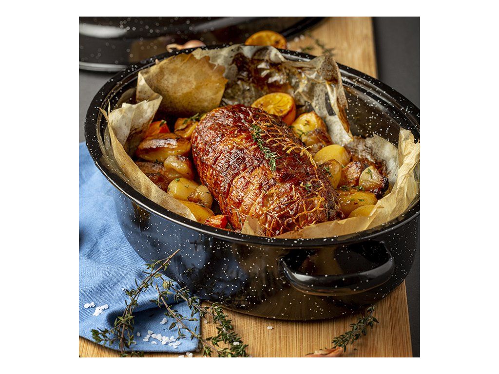 Oválný smaltovaný pekáč o objemu 6 litrů je ideální pro každodenní použití v kuchyni. Pekáč je vyroben z uhlíkové oceli a smaltovaného povlaku. Smalt je materiál, který se rychle zahřívá a pomalu ochlazuje, čímž udrží vařené jídlo déle teplé. Zajišťuje rovnoměrné rozložení tepla během pečení. Vykazuje velkou odolnost proti poškrábání a vysokým teplotám, je lehký, snadno se přenáší a čistí. Pekáč má dvě boční rukojeti pro snadné přenášení a je vybaven praktickým víkem s rukojetí. Vhodný do myčky