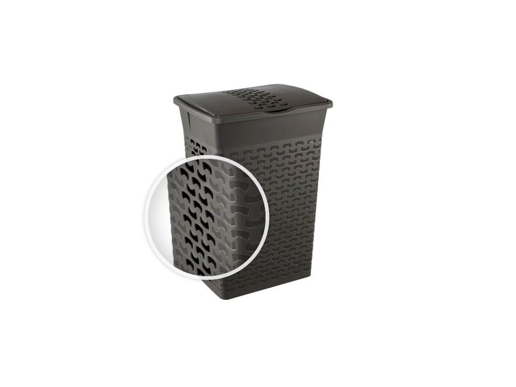 Prádelní koš s rozměry 426 x 300 x 520 mm je vyroben z kvalitního plastu. Má kompaktní, obdelníkový tvar, elegantní design a odnimatelné víko. Je vybaven úchyty pro snadnou manipulaci, estetické otvory po bocích umožňují cirkulaci vzduchu. Barevné provedení- antracit
