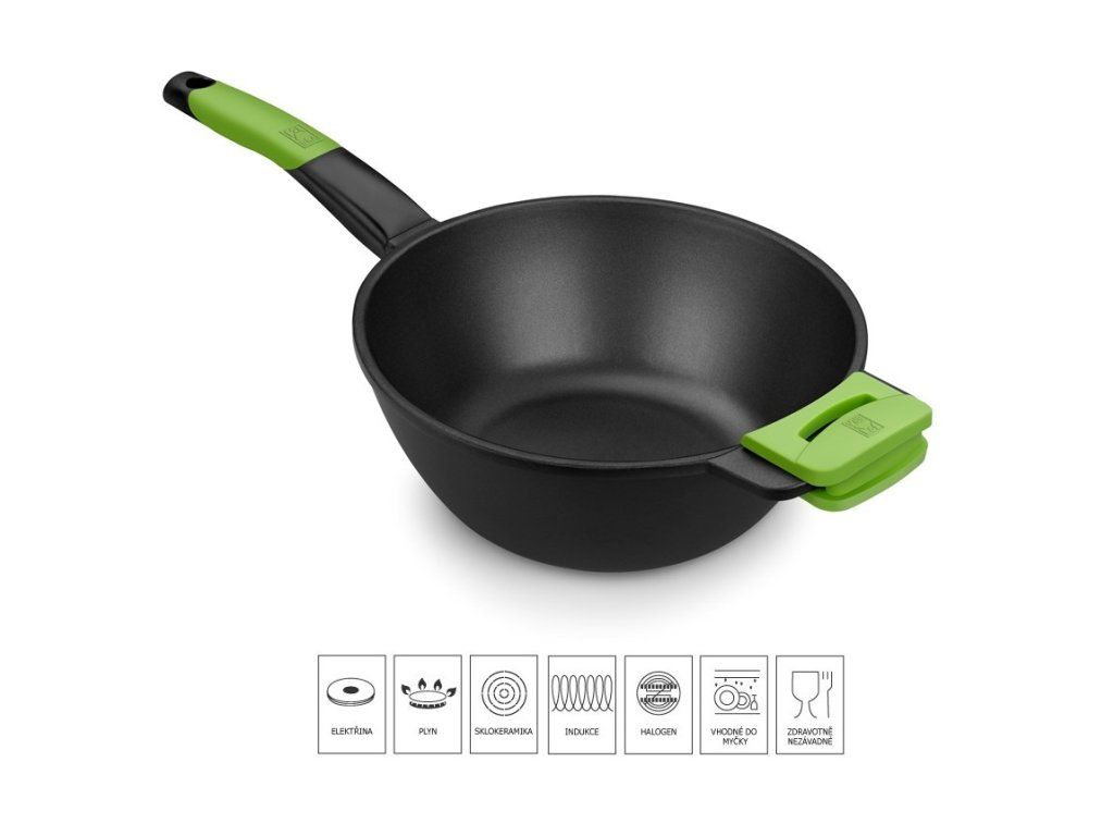Wok Prior je ideální wok pro každodenní použití v kuchyni. Kombinuje kvalitu s moderním designem. Jedná se o robustní wok vyrobený z litého hliníku s nepřilnavým povrchem Teflon Classic bez PFOA. Ergonomická černá rukojeť se zeleným silikonem pro příjemné a bezpečné uchopení, součástí je i odnímatelná silikonová chňapka. Má také vynikající rozložení teploty pro dokonalou přípravu asijských specialit. Snadno se čistí, je vhodný i do myčky na nádobí. Wok pánev o průměru 28 cm má průměr základny 15 cm a výšku 12 cm