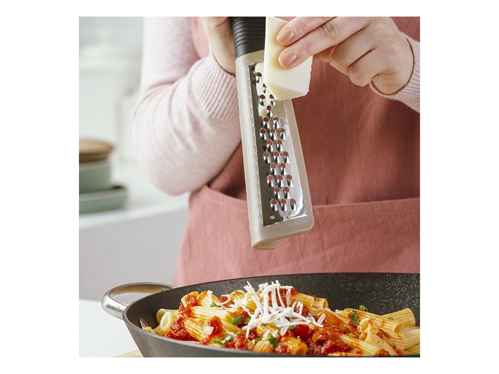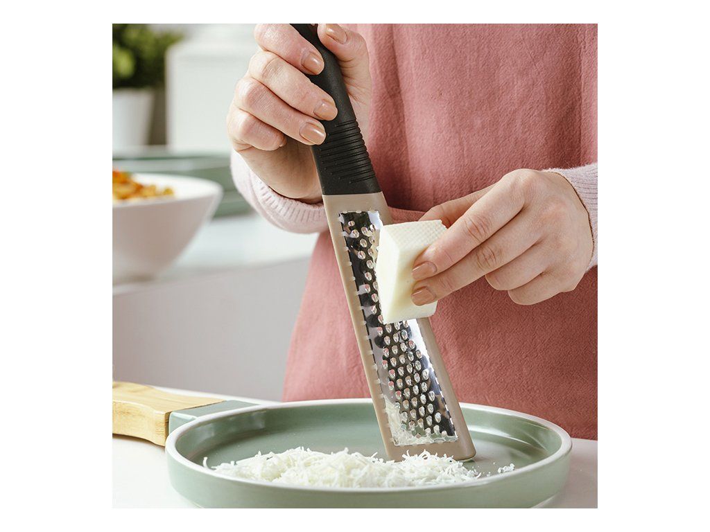 Nerezové struhadlo Misty od NAVA je nezbytným nástrojem téměř ve všech receptech na vaření, ale i v cukrářských receptech, protože pokrývá širokou škálu potřeb při přípravě pokrmů, ať už během samotného vaření nebo při zdobení pokrmu. Čepele z nerezové oceli , vhodné pro kontakt s potravinami, s pevným šedým plastovým rámem a ergonomickou protiskluzovou rukojetí soft touch pro stabilní a bezpečnou manipulaci. V elegantním, zaobleném designu a praktické velikosti pro snadné skladování. Má dva povrchy, pro hrubé nebo jemné strouhání , zatímco praktický otvor na okraji umožňuje jeho zavěšení.