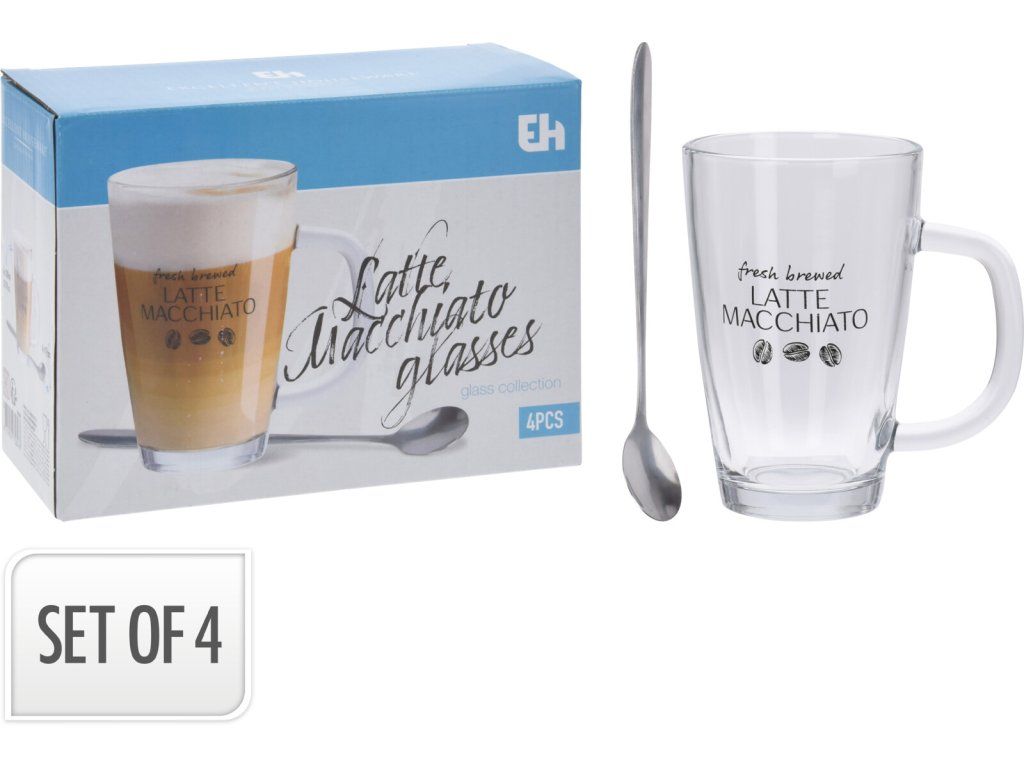 Objem sklenic 300 ml, výška 12 cm, průměr 8 cm. Délka lžiček 19 cm.
