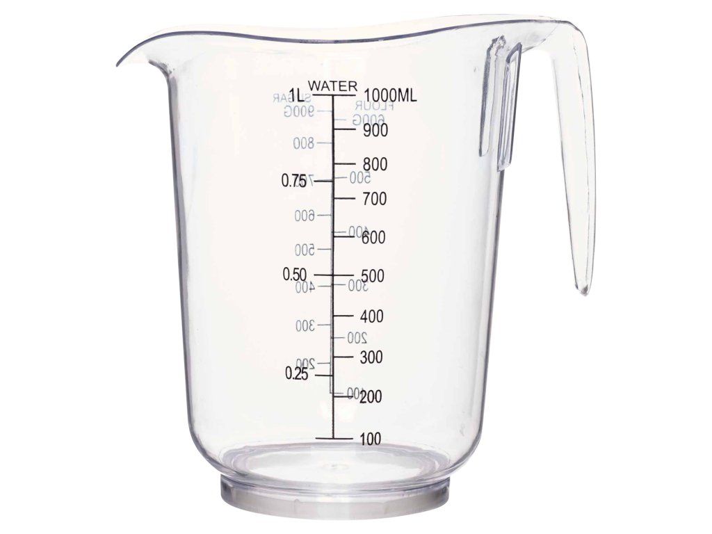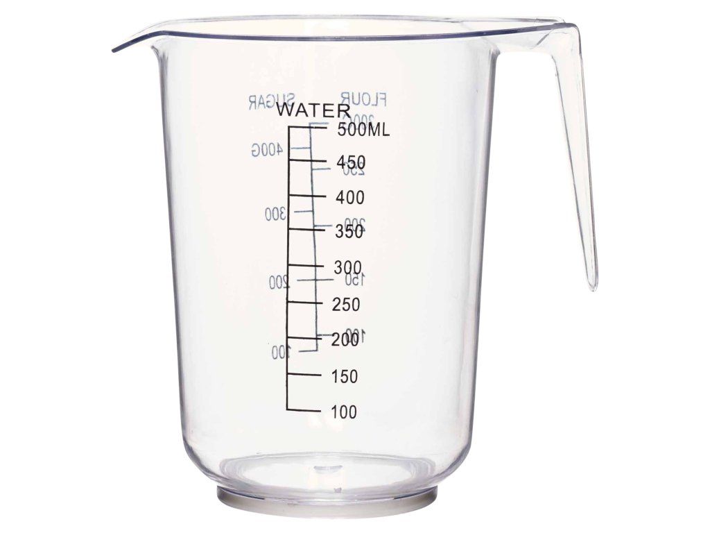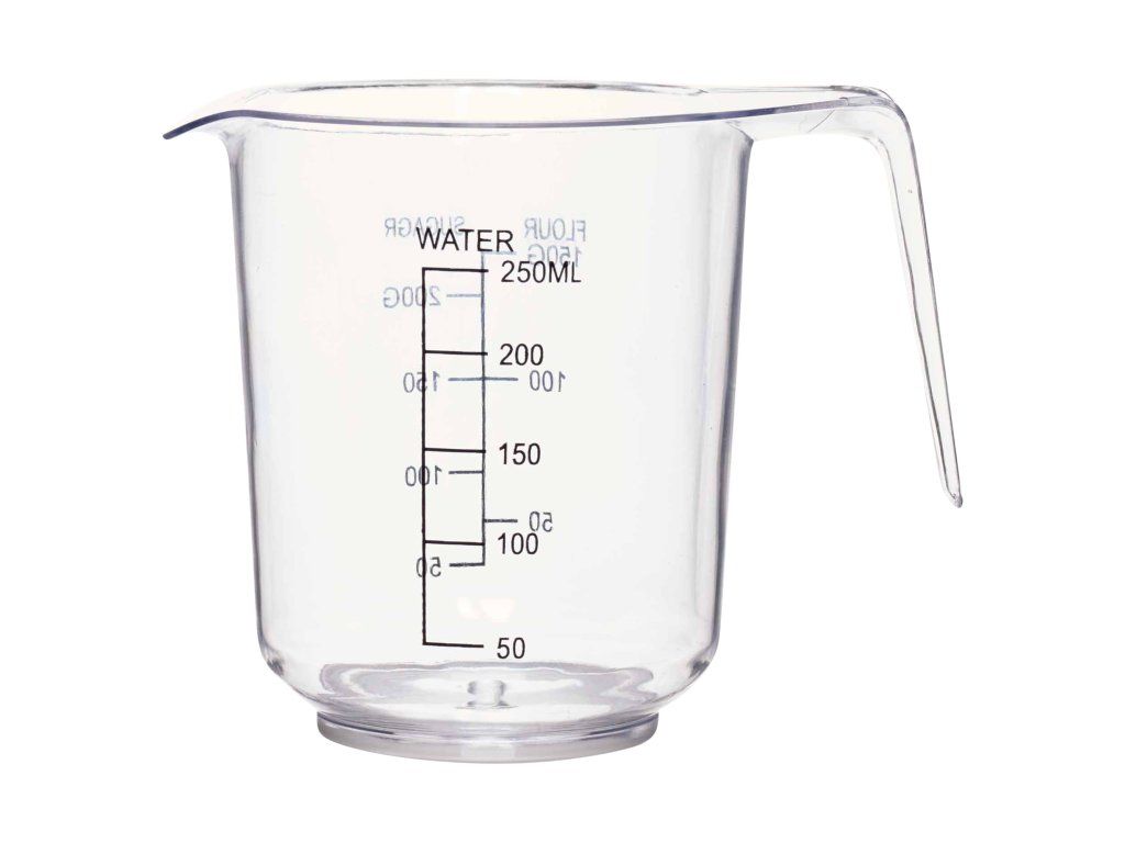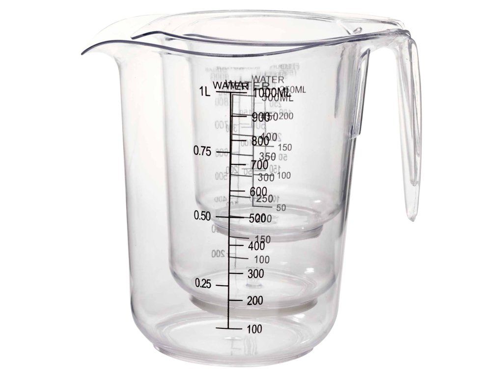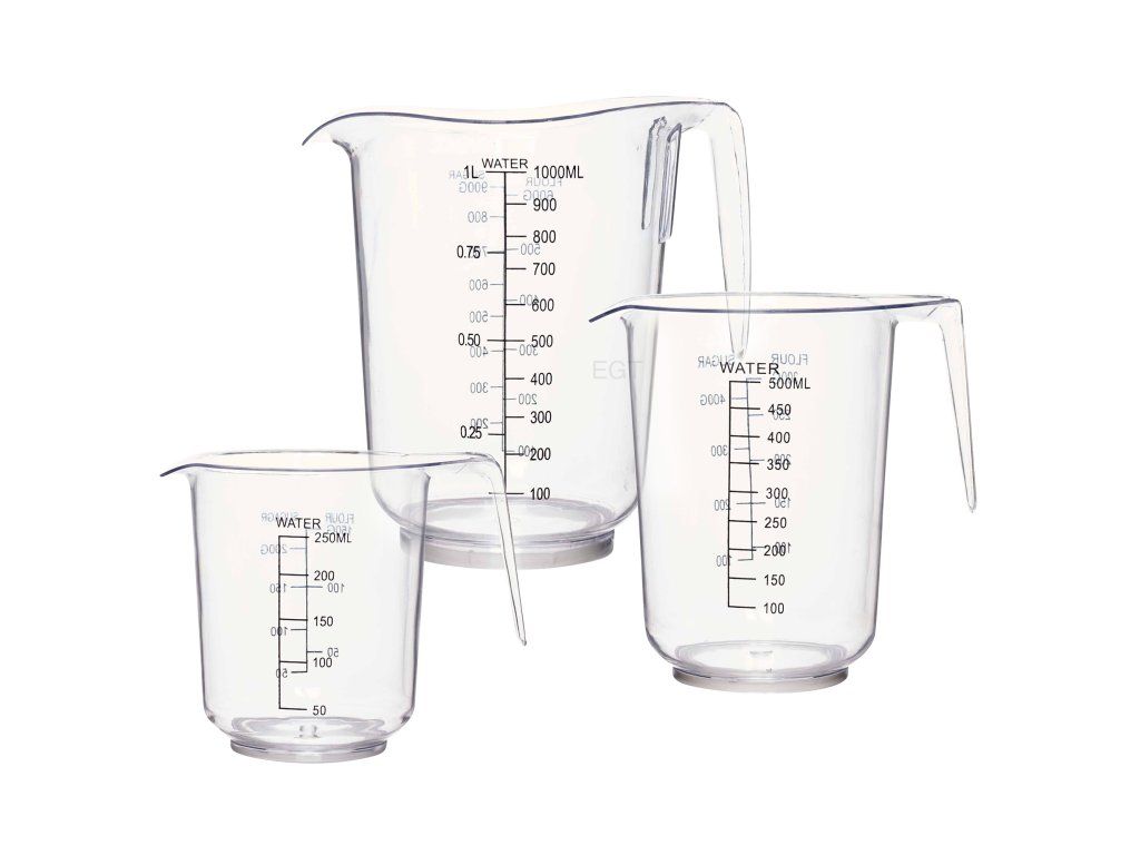 Plastové odměrky s třemi hodnotami měření (na tekutiny, na mouku, na cukr).