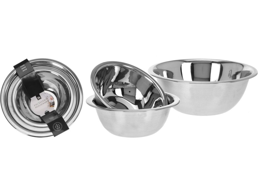 Sada, kterou oceníte ve své kuchyni. Tři misky vyrobené z kvalitní nerezové oceli jsou ideální pro přípravu pokrmů, salátů, nakládání masa nebo skladování ovoce a zeleniny. Stohovatelné, hygienicky nezávadné, snadno se udržují, jednoduše vynikající pomocník pro každou příležitost. Mísy mají průměr 18 cm, objem 700 ml; 20 cm, objem 950 ml a 24 cm s objemem 1900 ml. Výška 9 cm