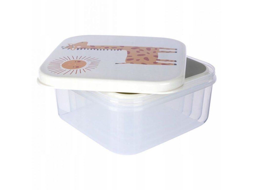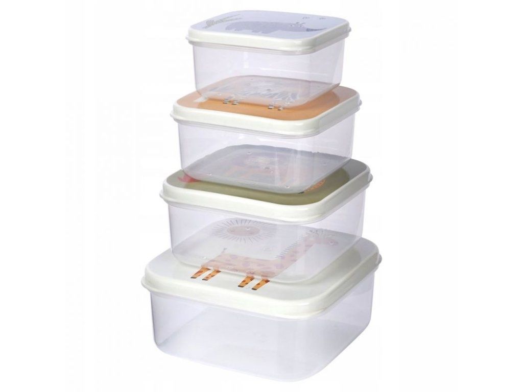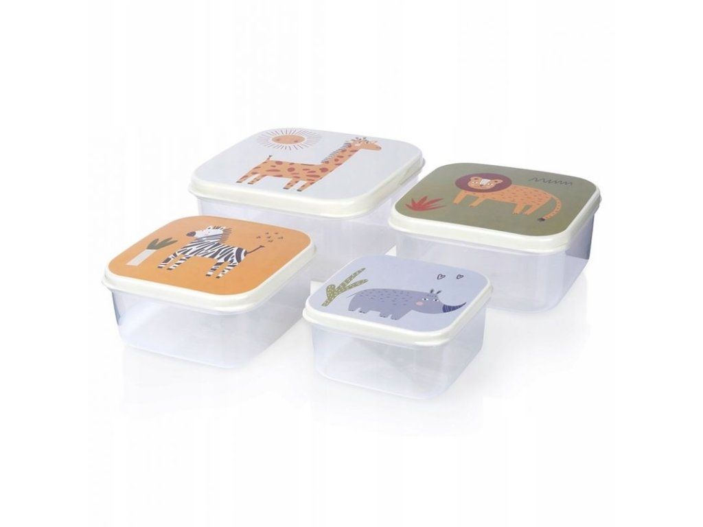 Sada čtyř dóz pro skladování a přenášení potravin. Sada obsahuje nádobky ve čtyřech různých velikostech: 1x 1000 ml (14 x 14 x 6,5 cm), 1x 650 ml (12 x 12 x 6 cm), 1x 450 ml (10,5 x 10,5 x 5 cm) a 1x 300 ml (9 x 9 x 4,5 cm). Jsou vyrobeny z kvalitního plastu v transparentní barvě, víčka mají barevný, dětský dekor s motivem žirafy, lva, zebry a nosorožce, který děti povzbudí k jídlu. Vyrobeno ze zdravotně nezávadných a potravinově neutrálních materiálů - bez BPA. Jsou vhodné do myčky nádobí (bez víček). Stohovatelné, takže zabírají málo místa.