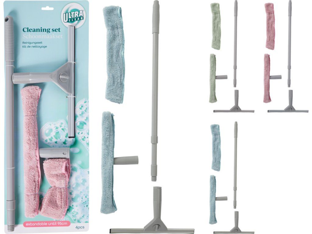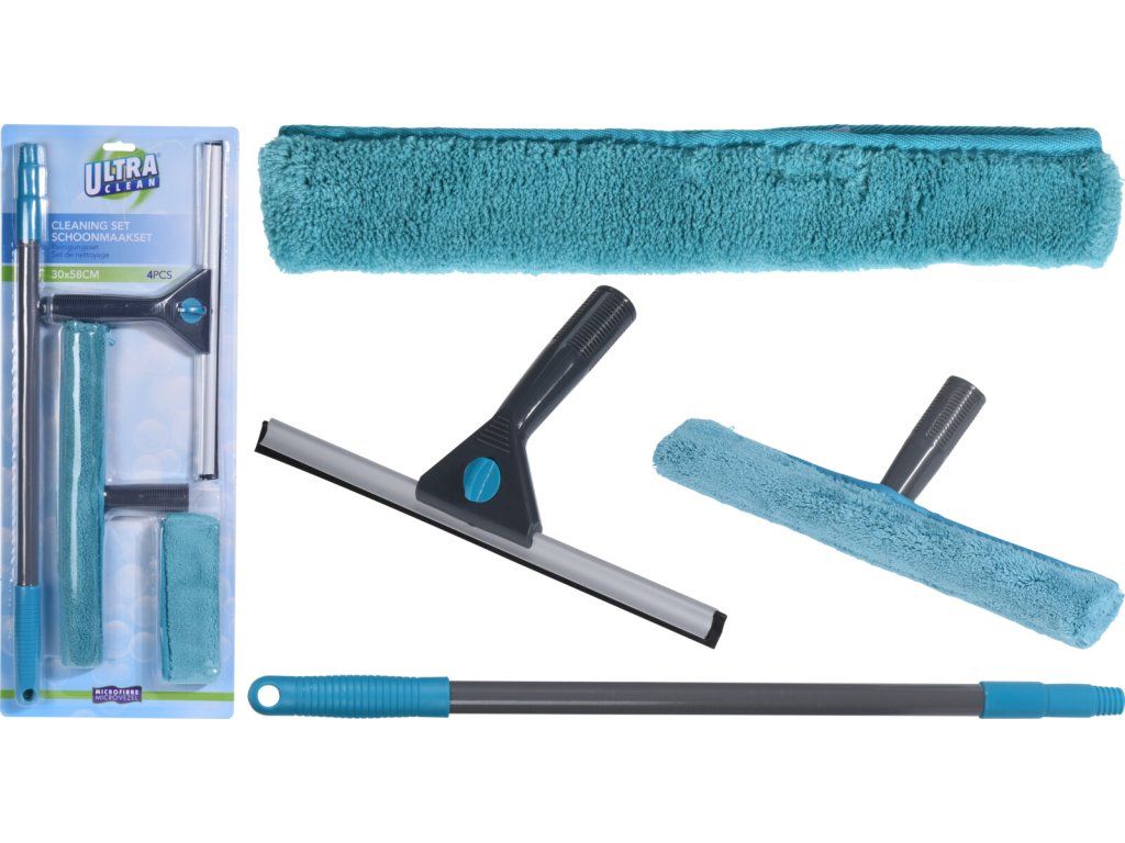 Praktická sada slouží k mytí oken, výloh, skleněných příček. Díky této inovativní sadě budete bez obtíží umývat i velká balkonová nebo terasová okna. Kombinuje se se stěrkou na okna a stěrkou s rozmývacím návlekem. Součástí je také teleskopická tyč. Rozměry gumové stěrky jsou 35x17 cm, stěrka s rozmývacím návlekem má 35x13 cm. Teleskopická tyč má rozpětí 57 - 94 cm.