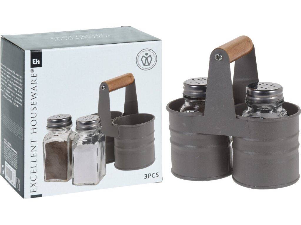 Sada na sůl a pepř s kovovým stojánkem soudek, sklo a kov