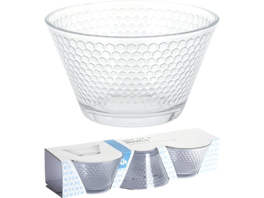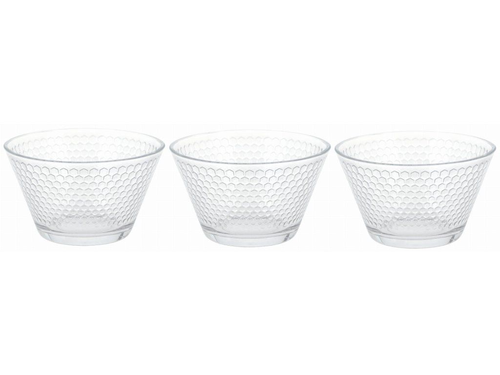 Sada 3 ks skleněných misek se vyznačuje atraktivním designem v motivu včelích pláství a mají univerzální použití. Lze je využít na servírování kompotů, salátů, zeleniny a ovoce. Fantazii se meze nekladou.