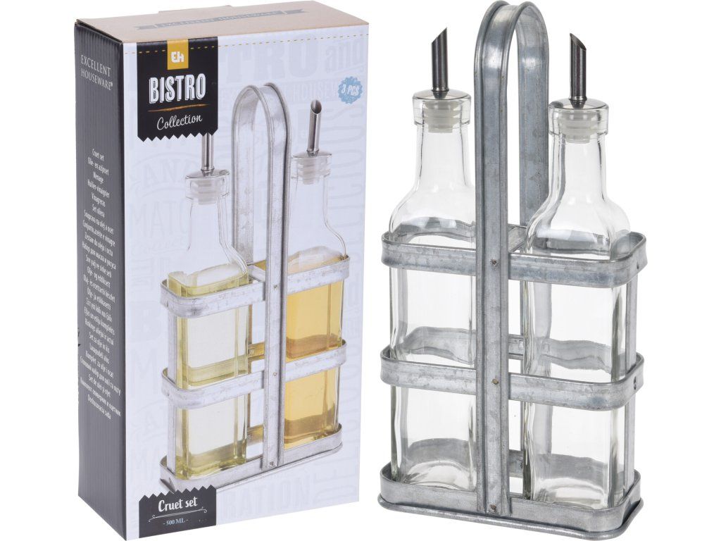 Stolní dochucovací souprava. Vhodná pro domácnosti i gastronomická zařízení. Vyrobena z prvotřídní nerezavějící oceli a skla. Objem lahvičky 500 ml.