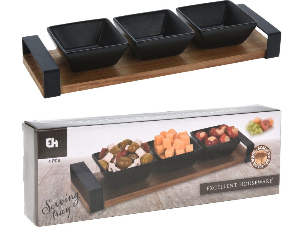 Sada je ideální pro servírování různých pokrmů, jako jsou saláty, dezerty, oříšky nebo jiné občerstvení. Může se také použít jako dekorace na jídelní stůl. Rozměry: délka tácku 32 cm, šířka 10 cm, výška 4 cm. Rozměry misky: 8x8x3,5 cm