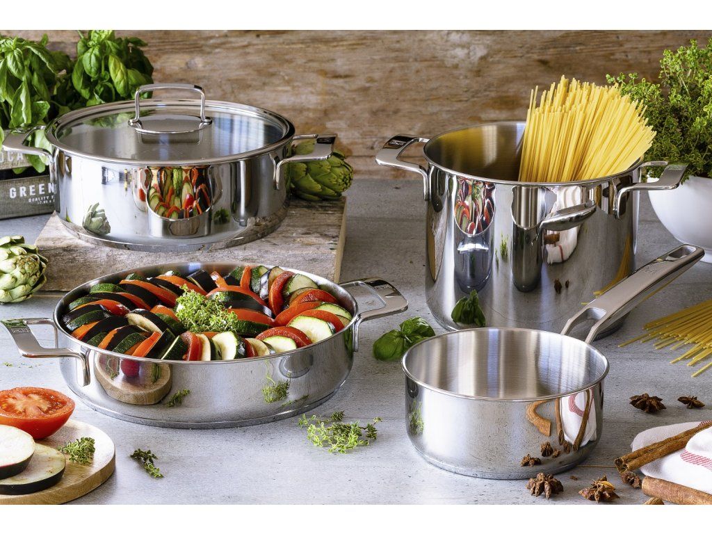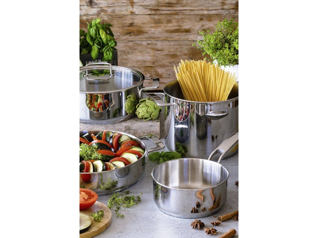 Nerezové nádobí řady Signature je vyrobeno z vysoce kvalitní nerezové oceli a má elegantní a funkční design. Sada se skládá ze 4 kusů, hrnce mají lesklý povrch, ergonomické úchyty pro pohodlné přenášení a pokličky z tvrzeného skla. Nádobí je vhodné pro všechny typy vařičů (včetně indukce) a je opatřeno extra silným sendvičovým dnem. Z toho důvodu umožňují hrnce vynikající rozložení teploty pro dokonalé uvaření všech našich receptů. Součástí sady je rendlík o průměru 14 cm s objemem 1l, hrnec o průměru 20 cm s objemem 2,25l, hrnec o průměru 24 cm s objemem 3,75l a vysoký hrnec o průměru 24 cm s objemem 8,5l.