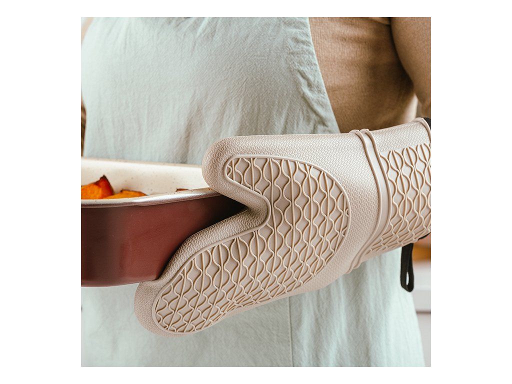 Pro pohodlnou a bezpečnou manipulaci s horkými pánvemi a hrnci použijte silikonové rukavice do trouby Misty od NAVA. Rukavice zajišťuje stabilní a pohodlný úchop a extrémně snadno se čistí. Se speciálním, reliéfním, protiskluzovým povrchem, vyrobeným z vnější strany z měkkého, pružného silikonu vysoké kvality, odolným vůči vysokým teplotám a s tkaninou uvnitř. S praktickým poutkem na okraji k zavěšení.