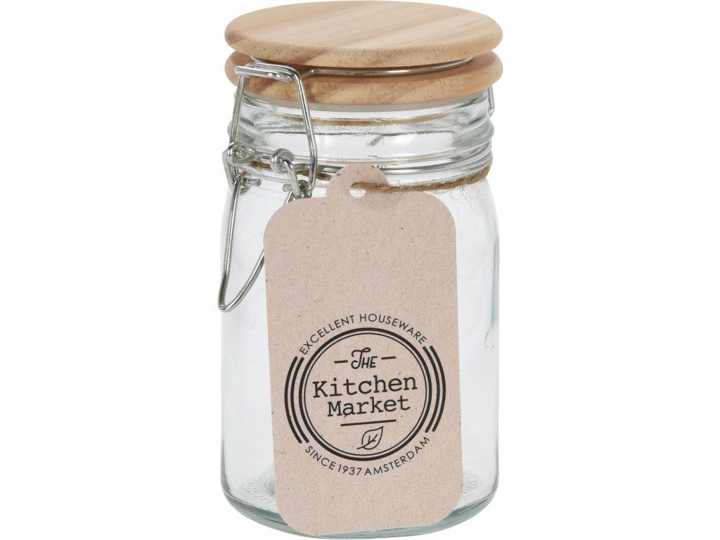 Uzavíratelná dóza z čirého skla pro skladování potravin s drátěným klipem a gumovým těsněním. Lze použít ke skladování, zavařování, na paštiky, mastičky nebo krémy. Vzduchotěsné dřevěné víko pomáhá déle uchovávat chuť a aroma jídla. Výška 12 cm, průměr dna 6,5 cm, objem 270 ml