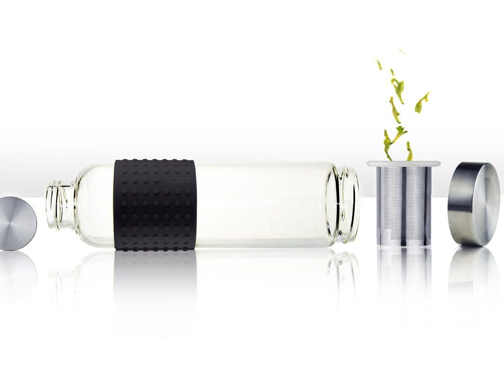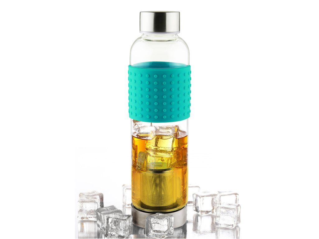 Skleněná trendy láhev s nerezovým infuserem pro přípravu ledového čaje nebo ledové kávy.