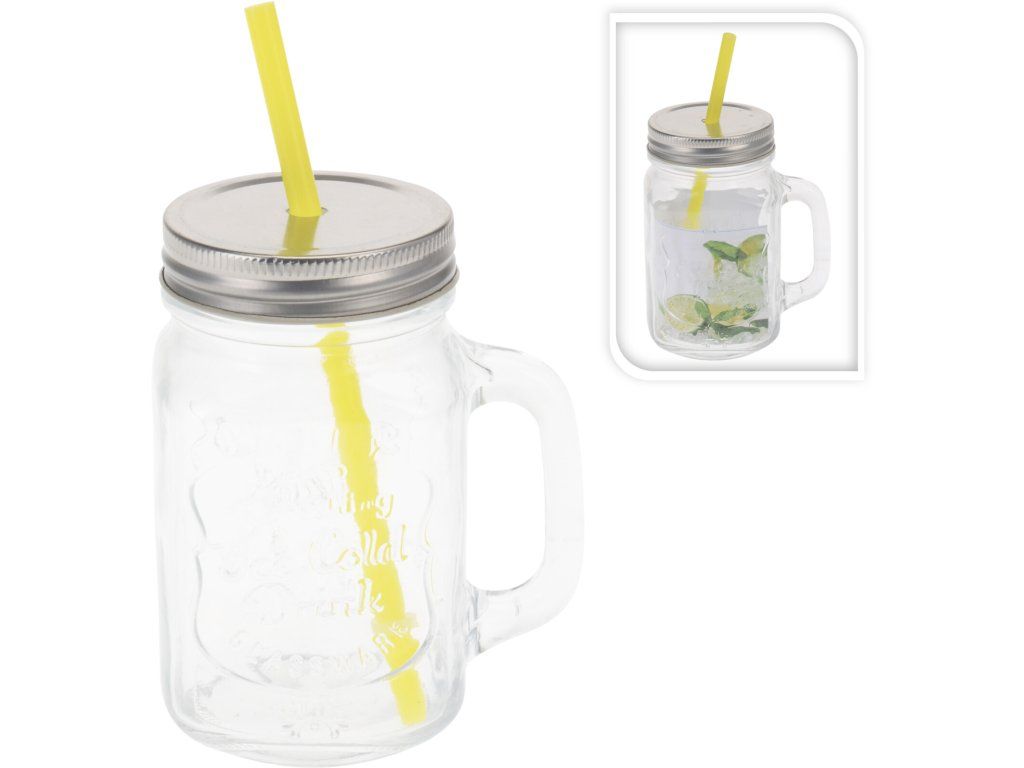 Praktická sklenice s víčkem a brčkem o objemu 450 ml skvěle poslouží pro letní osvěžení v podobě domácí limonády, džusu a jiných nápojů. Rozměry: výška 13 cm, průměr 7 cm, brčko je vyrobeno z kvalitního pevného plastu, víčko je plechové. Skleničku zdobí reliéfní vintage motiv.
