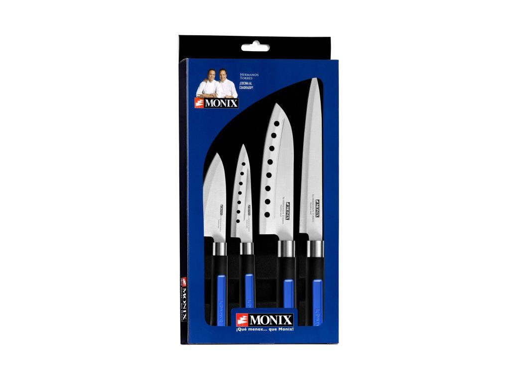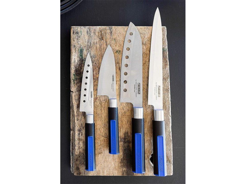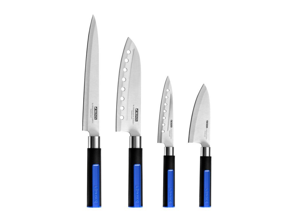 Sada vysoce kvalitních kuchyňských nožů. Set obsahuje: kuchyňský nůž 20 cm, nůž na maso 17 cm, univerzální nůž 12 cm, kuchařský nůž 10 cm. Atraktivní design, vyrobeno z kvalitní nerezové oceli. Rukojeti z pevného plastu.