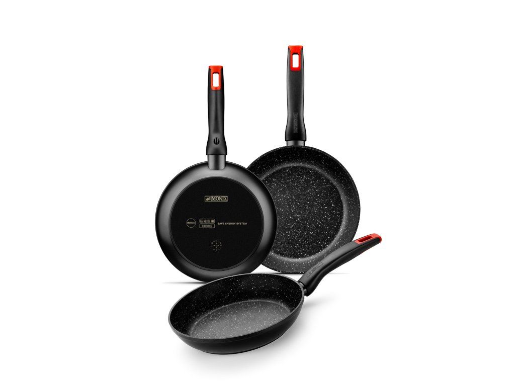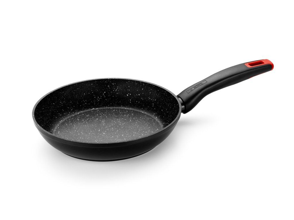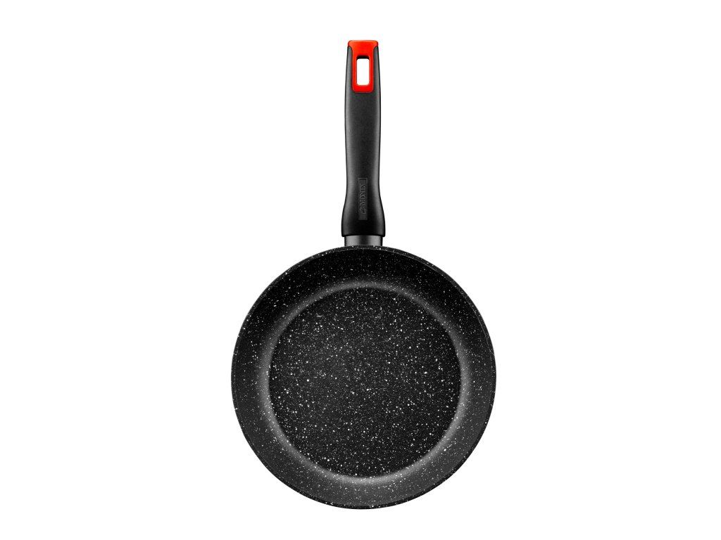 Pánev série Titan rock je ideální pánev pro každodenní použití v kuchyni. Kombinuje kvalitu s moderním designem. Jedná se o vysoce kvalitní minerální pánev z kovaného hliníku, má silné zabroušené ocelové nedeformující se dno. Ergonomická černá rukojeť s červeným silikonem pro příjemné a bezpečné uchopení. Perfektní rozptyl tepla po celé vařící ploše. Ultra odolný povrch pánve je složen ze tří vrstev nepřilnavého, minerály obohaceného povrchu Quantanium TITANIUM, který obsahuje i částice titanu a tím zajišťuje jeho tvrdost a odolnost. Snadno se čistí, je vhodná i do myčky na nádobí. Hodí se pro veškeré tepelné zdroje: plynové, elektrické, keramické, halogenové a indukční. Pánev o průměru 18 cm má průměr základny 13 cm a výšku 5,5 cm