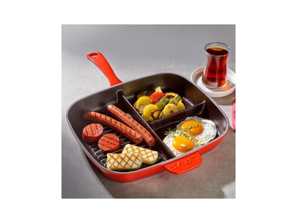 Představivosti a kreativitě se meze nekladou. Tato robustní litinová pánev je rozdělená na tři pole s (2x hladký povrch, 1x grilovací), díky kterým můžete zároveň připravovat fazole, vejce a nebo šunku a slaninu. Litinová pánev o rozměrech 26x30 cm je vyrobena z kvalitní litiny, která má opravdu dlouhou životnost, perfektně vede teplo, je odolná proti korozi, poškrábání a odštípnutí. Pánvičku můžete používat na všech typech grilů a vařičů včetně indukce, je vhodná i pro zapékání v troubě a stane se tak praktickým pomocníkem ve Vaší kuchyni. Díky skvělým tepelným vlastnostem litiny můžete pokrmy z pánve rovnou servírovat, jídlo udržíte dlouho teplé. Litinové nádobí je oblíbené mezi šéfkuchaři, protože skvěle drží teplo a je prakticky nerozbitné.